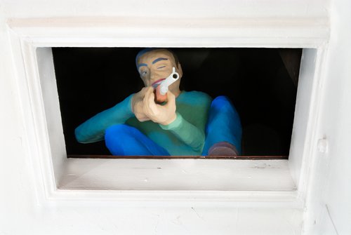 A three-dimensional comic-story, including a raining cloud, a blown out fireplace, 17 dead doves and a soon to be broken glass of Whiskey. 13 days before the opening a 17-year-old student killed 15 people as well as himself during his amoklauf through Winnenden and Wendlingen. One of the 15 rampages at schools in Germany with the first one dating back to the 25th May 1871.